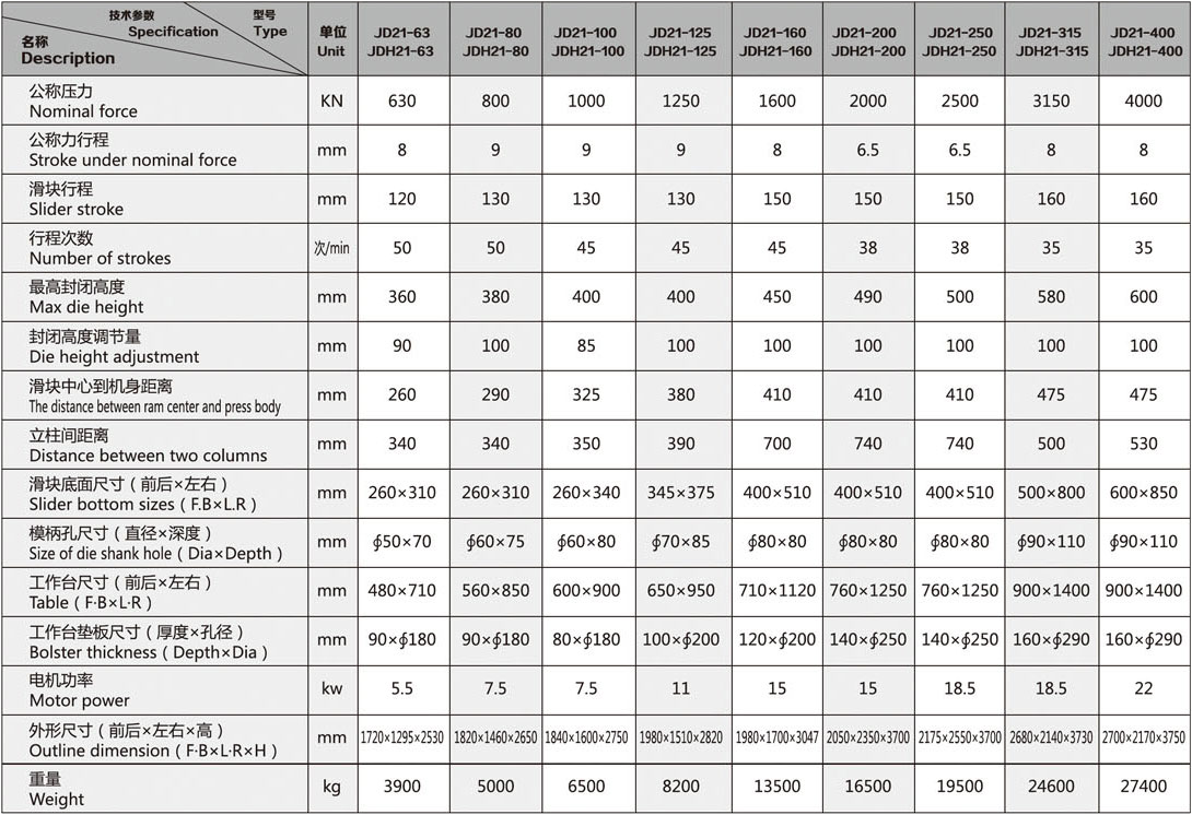 采用整體鑄鐵機身,不可傾斜,廣泛應(yīng)用于沖孔、落料、彎曲、淺拉伸、成型等冷沖壓工藝。
